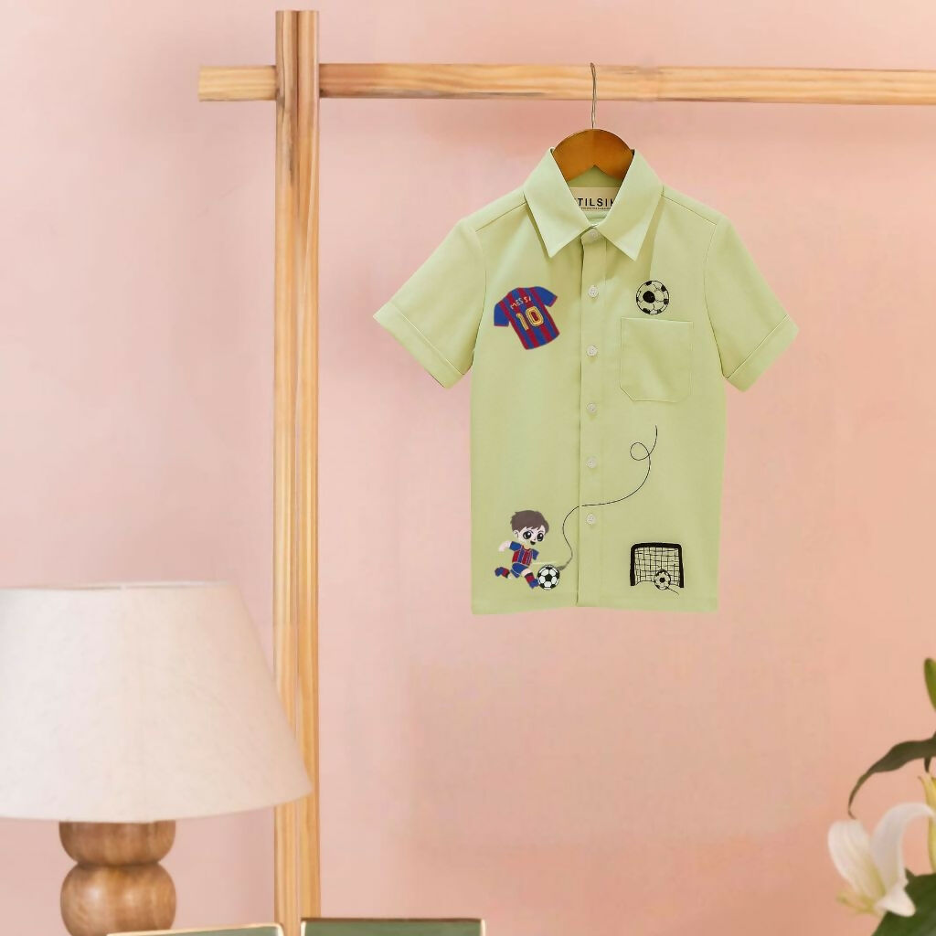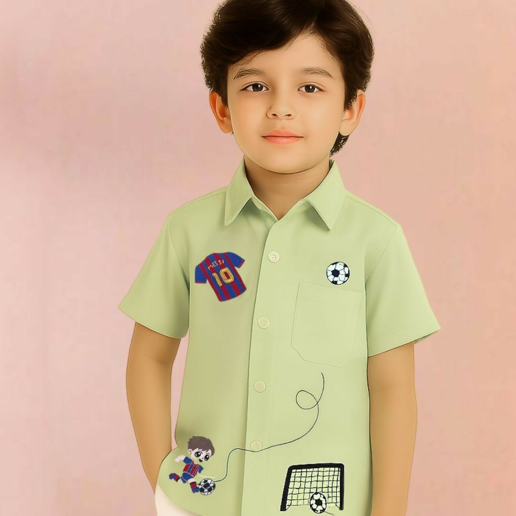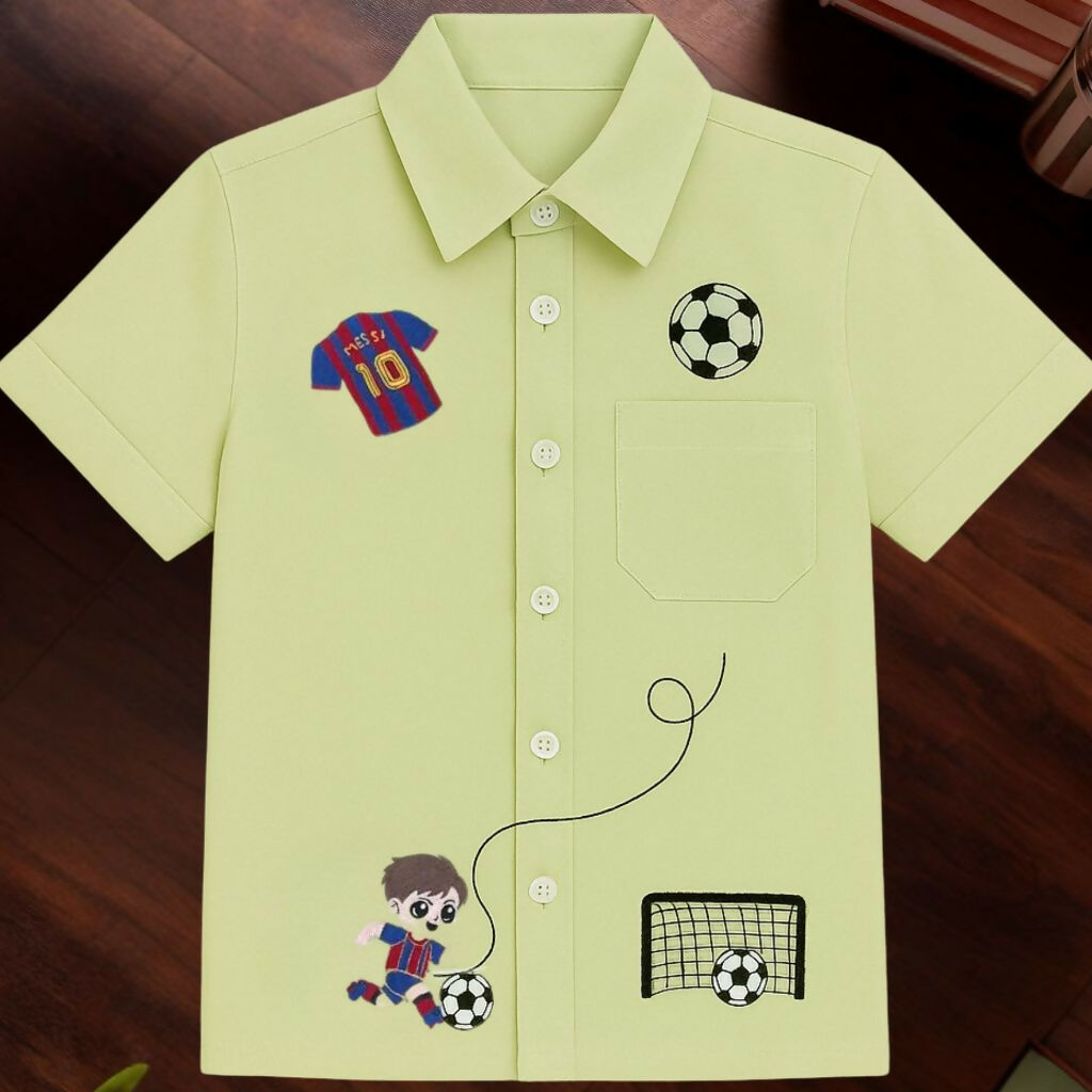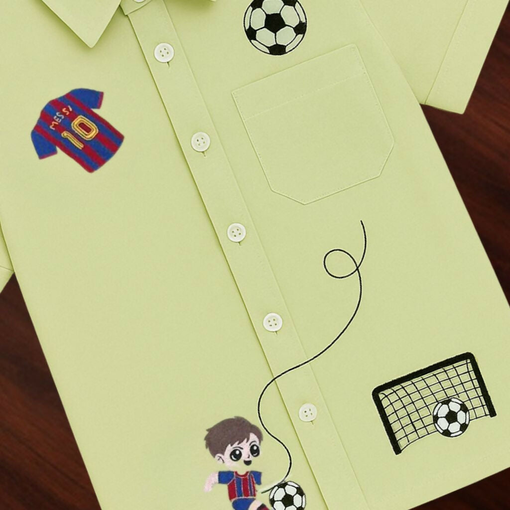 This light green boy's shirt features fun soccer-themed embroidery, including a jersey, football, goalpost, and a playful cartoon player. With its button-down style and soft fabric, it’s perfect for young sports enthusiasts who love comfort and style combined.