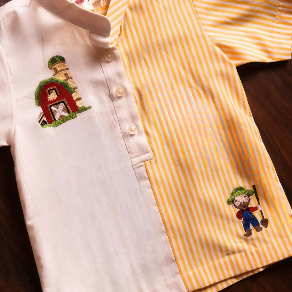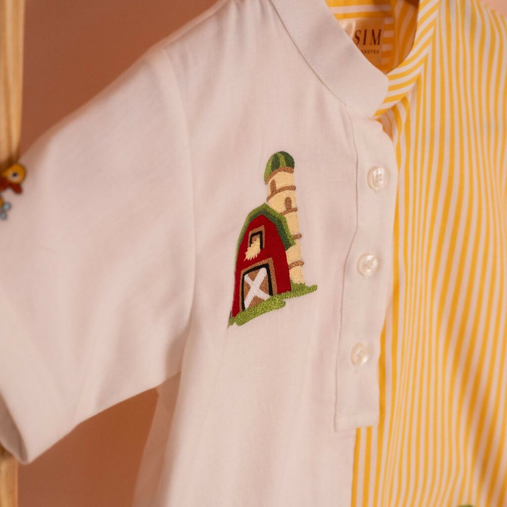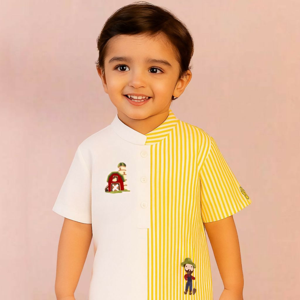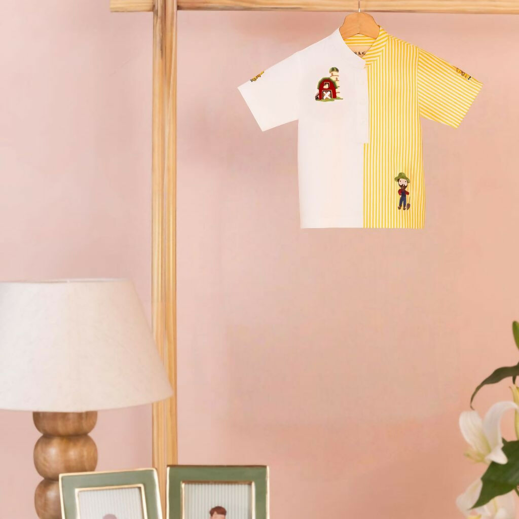 This charming shirt features a playful half-and-half design with white and yellow stripes, adorned with cute farm-themed embroidery including a barn and little farmers. The buttoned front and soft fabric make it both stylish and comfortable for everyday wear or special outings.