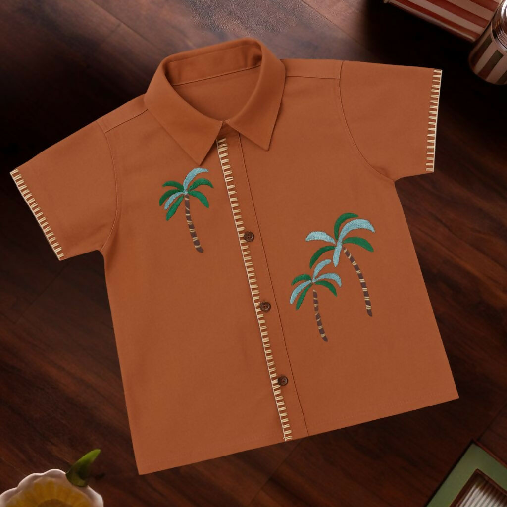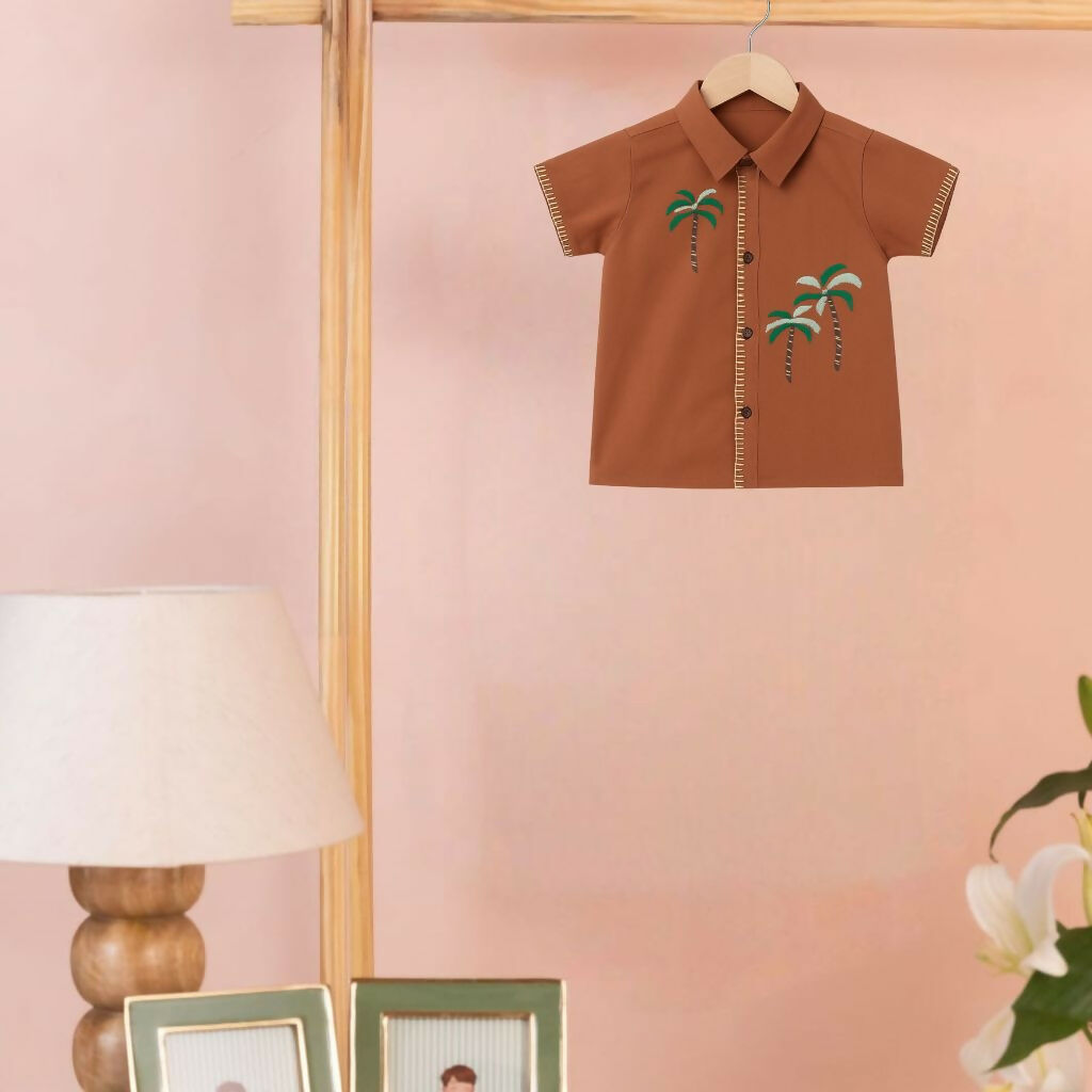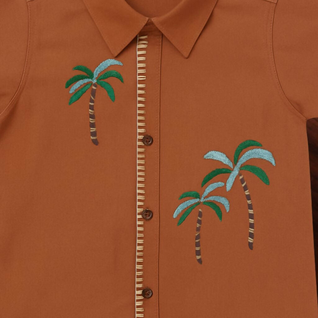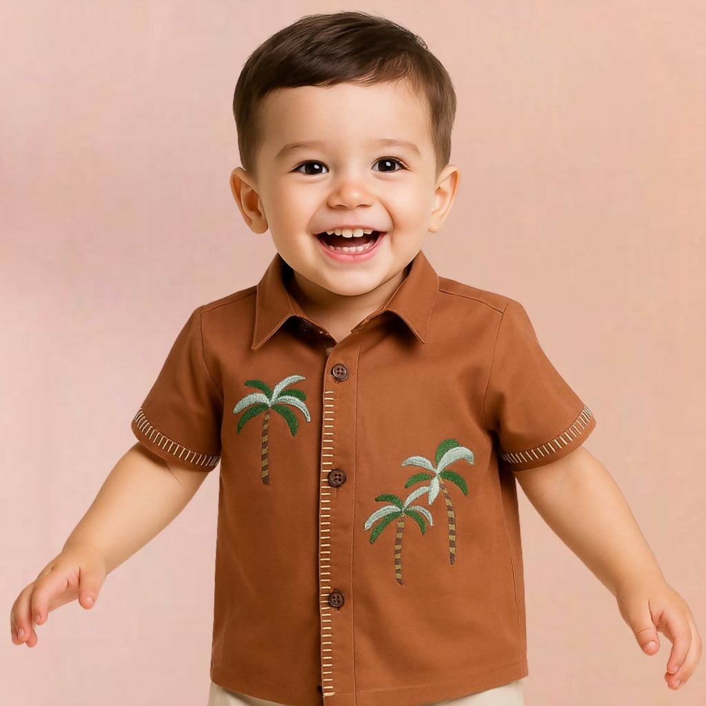 Tropical vibes. A brown button-down shirt with palm tree embroidery, perfect for your little one’s breezy, holiday-ready look.