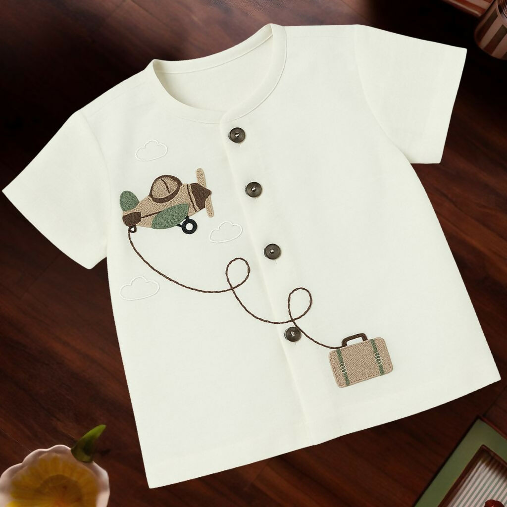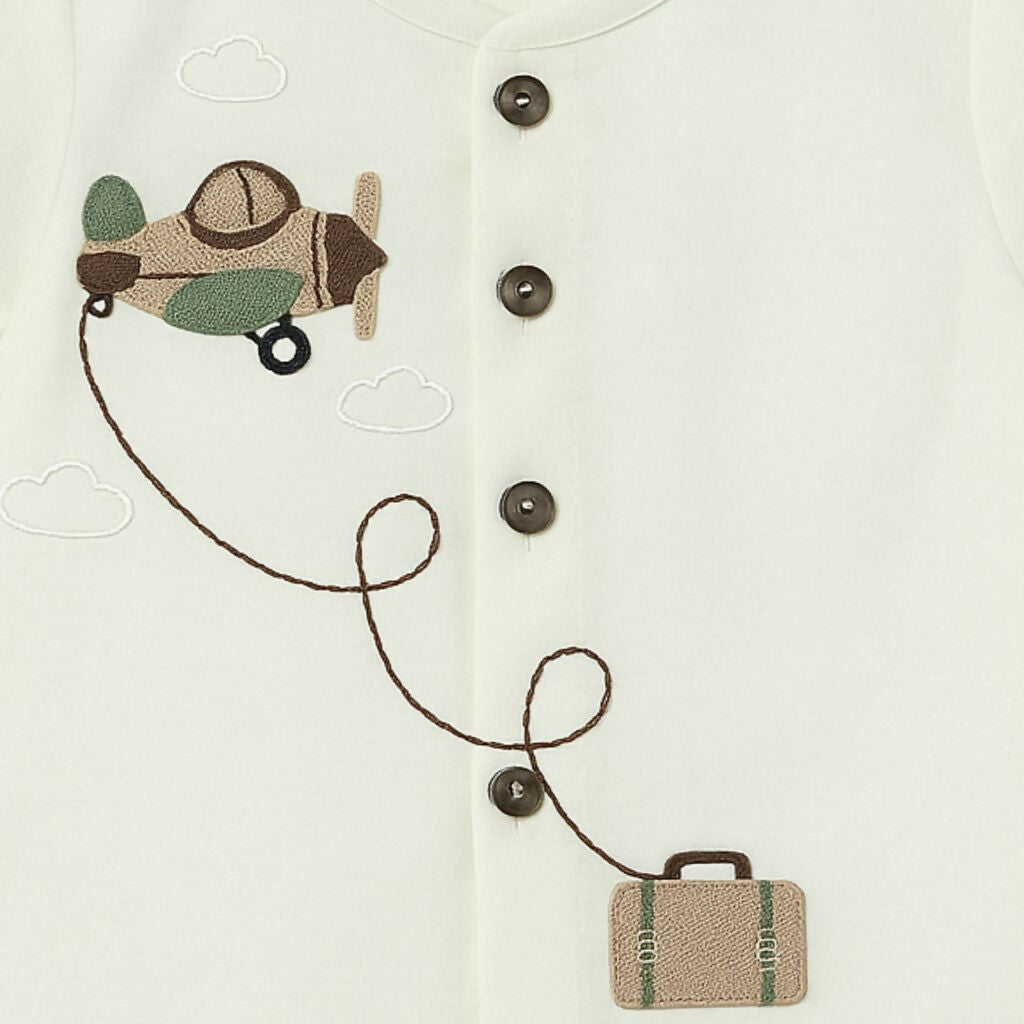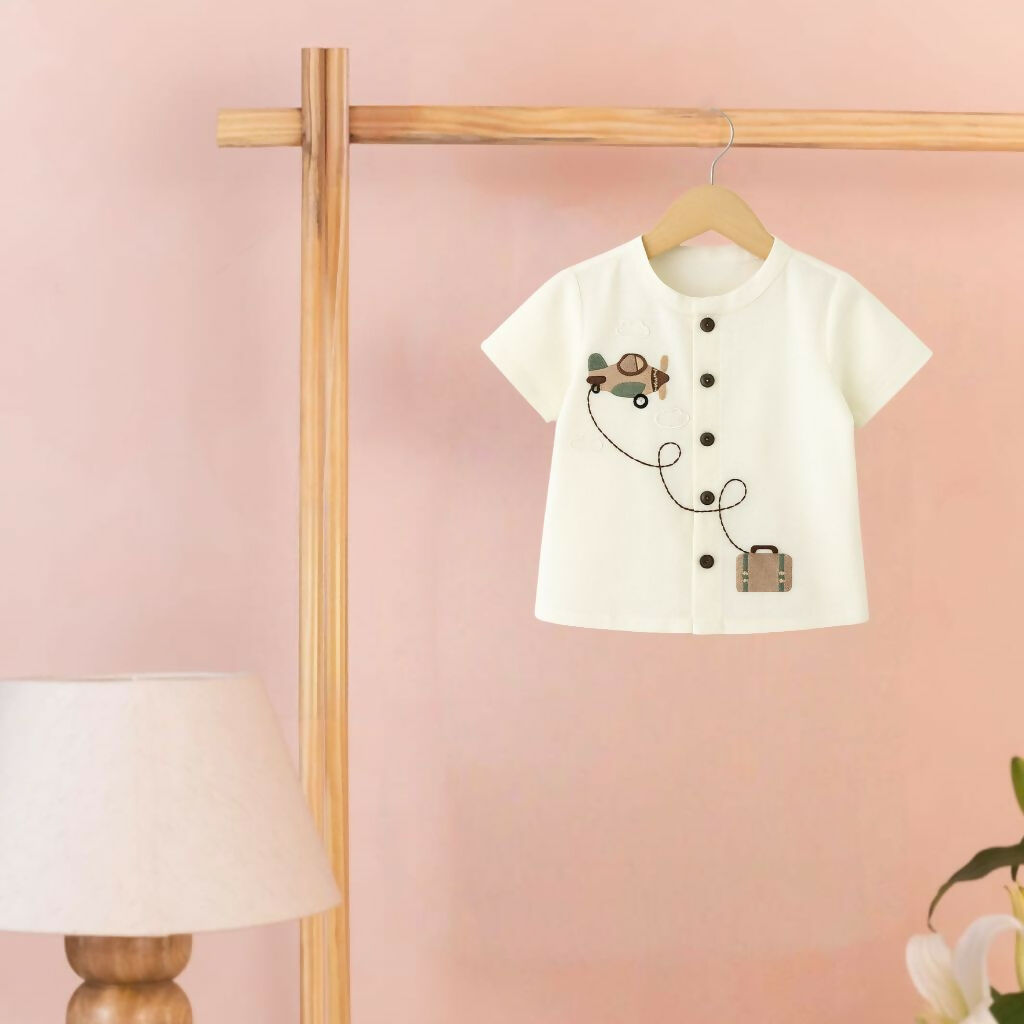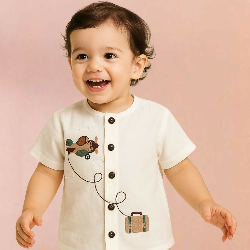 Fly high in style. This button-down shirt features delicate airplane & suitcase embroidery, crafted for your little explorer’s everyday adventures.