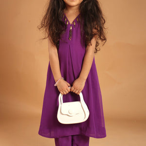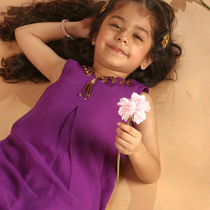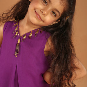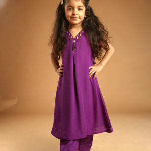 Delicate yet bold like the vibrant Zinnia flower, this deep purple kurta set is a graceful ensemble for your little one. Featuring a V-neck kurta adorned with gold bead and tassel embellishments and paired with matching pants, this outfit blends traditional elegance with playful charm. Ideal for festive occasions, it brings regal simplicity and floral inspiration together in one beautiful design.