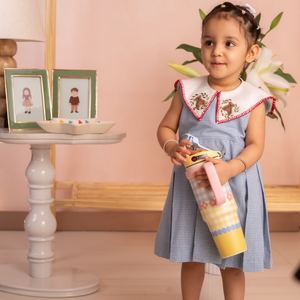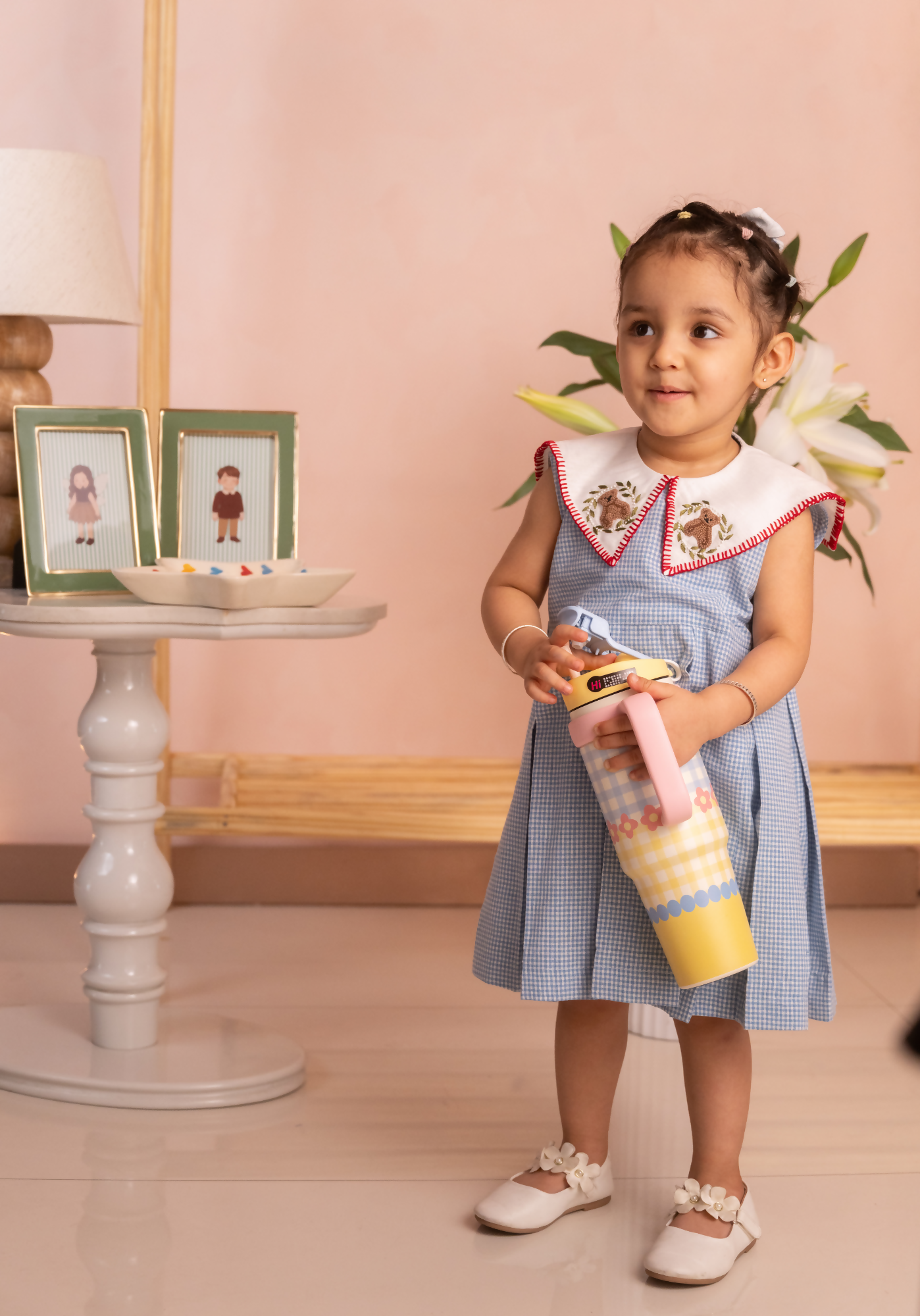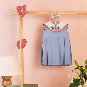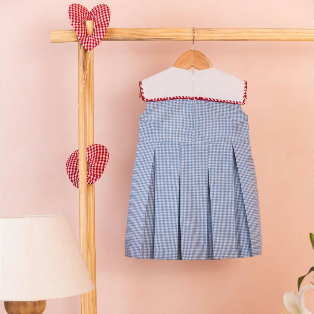 This classic pleated dress features a soft blue gingham fabric paired with a standout white statement collar, delicately hand-embroidered with floral teddy motifs and finished with bold red edging. It’s a charming blend of timeless style and playful detail—ideal for both everyday wear and special outings. This is a made-to-order product. It will take approximately 10 to 12 days to manufacture, and an additional 7 to 10 business days for delivery.