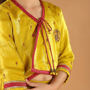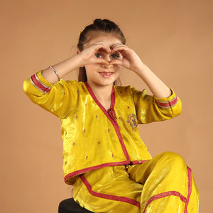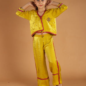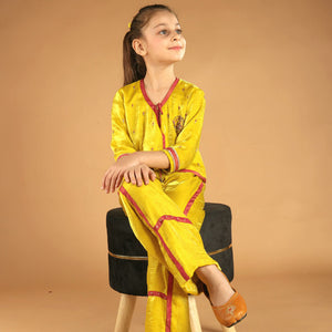 Bring sunshine to every celebration with our Haldi Hues Co-ord Set a vibrant two-piece ensemble designed for playful comfort and festive flair. This set features a breezy V-neck front-open top adorned with delicate embroidery and a traditional motif on the chest. The straight-fit pants are highlighted with contrast pink piping and handwork detailing at the sides and hems, adding just the right amount of sparkle. Perfect for haldi functions, weddings, or cultural events, this outfit blends tradition with a modern twist made for the little diva who loves to stand out.