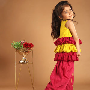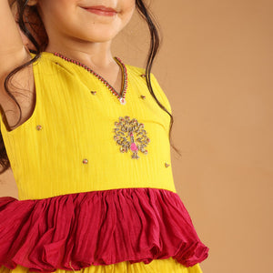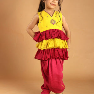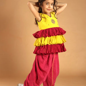 Brighten your childs festive outfit with this yellow and pink ruffle kurti and comfortable dhoti pant. Soft fabric and pretty embroidery make it ideal for celebrations and special occasions