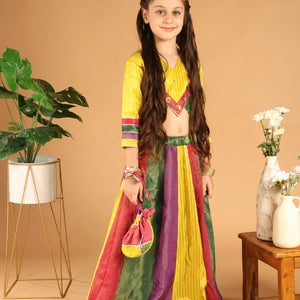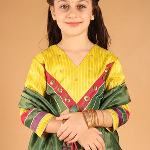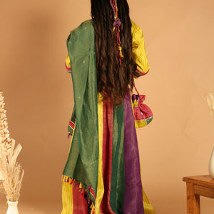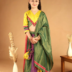 A festive lehenga set in rich jewel tones, featuring a vibrant lime green V-neck blouse with hand work and striped detailing, paired with a flared multi-color panel lehenga. Comes with a green dupatta, making it a perfect pick for weddings and festive occasions.