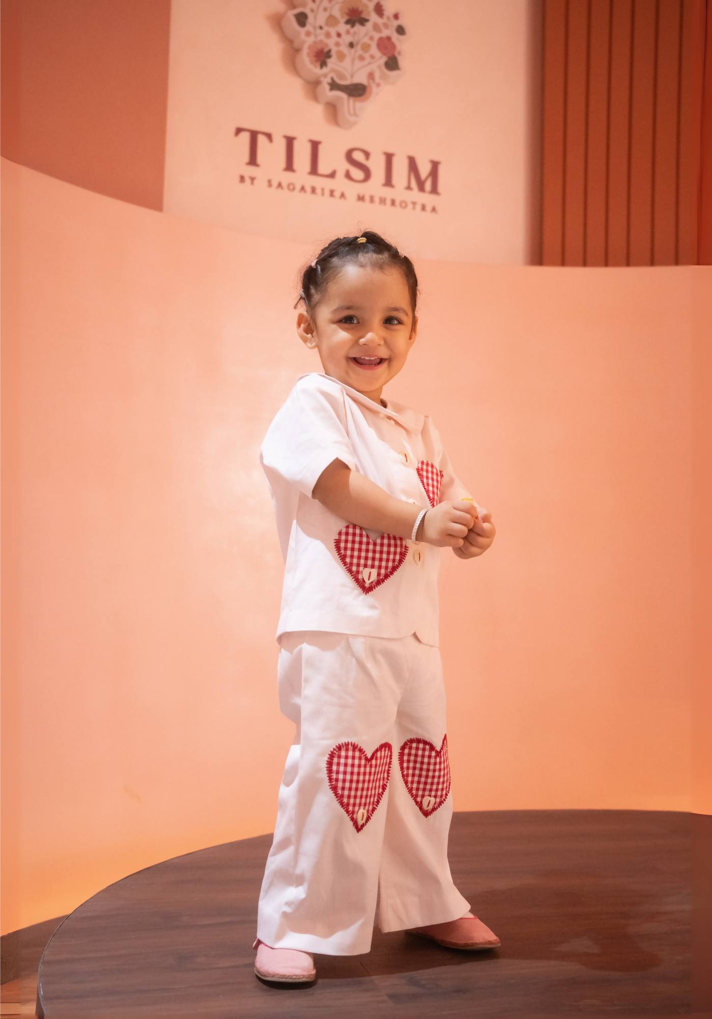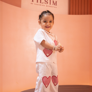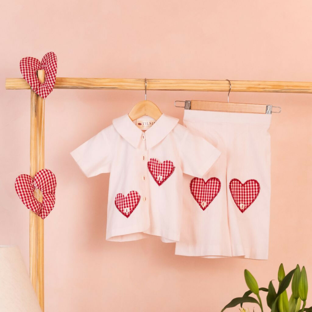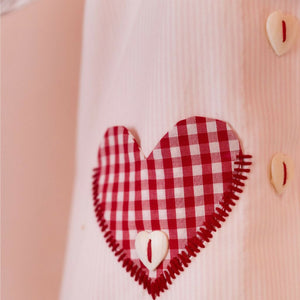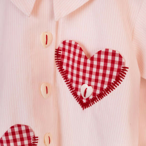 This playful co-ord set features a button-down shirt with a Peter Pan collar and matching pants, both adorned with red gingham heart appliqués. Crafted from soft, striped cotton, it blends charm and comfort for everyday wear or special outings. This is a made-to-order product. It will take approximately 10 to 12 days to manufacture, and an additional 7 to 10 business days for delivery.