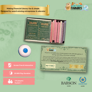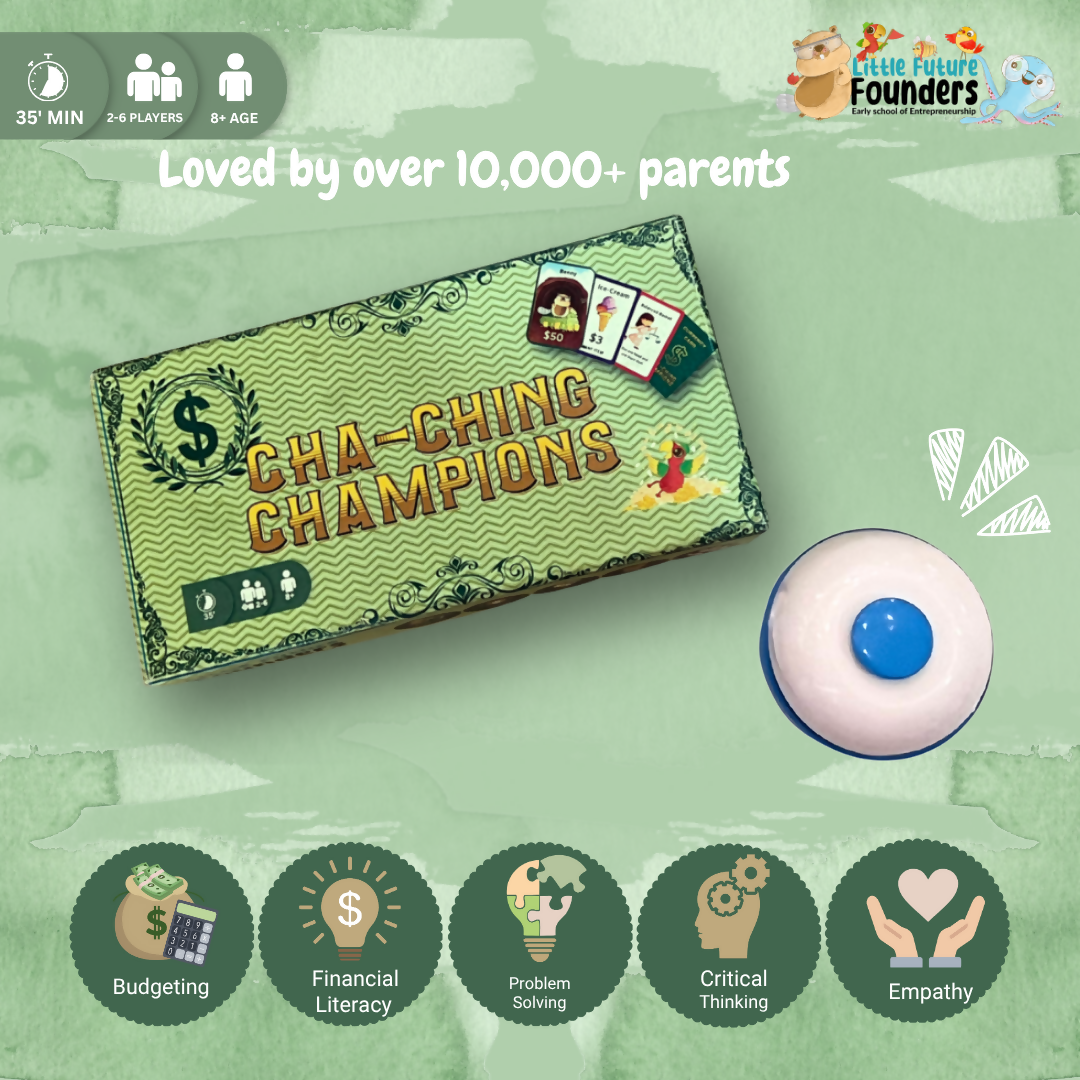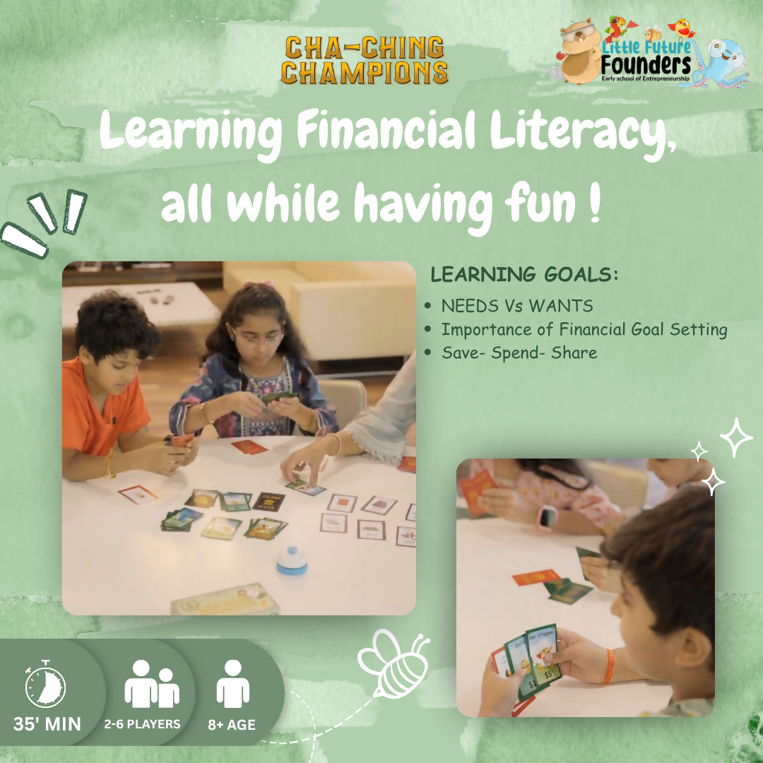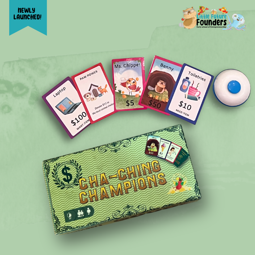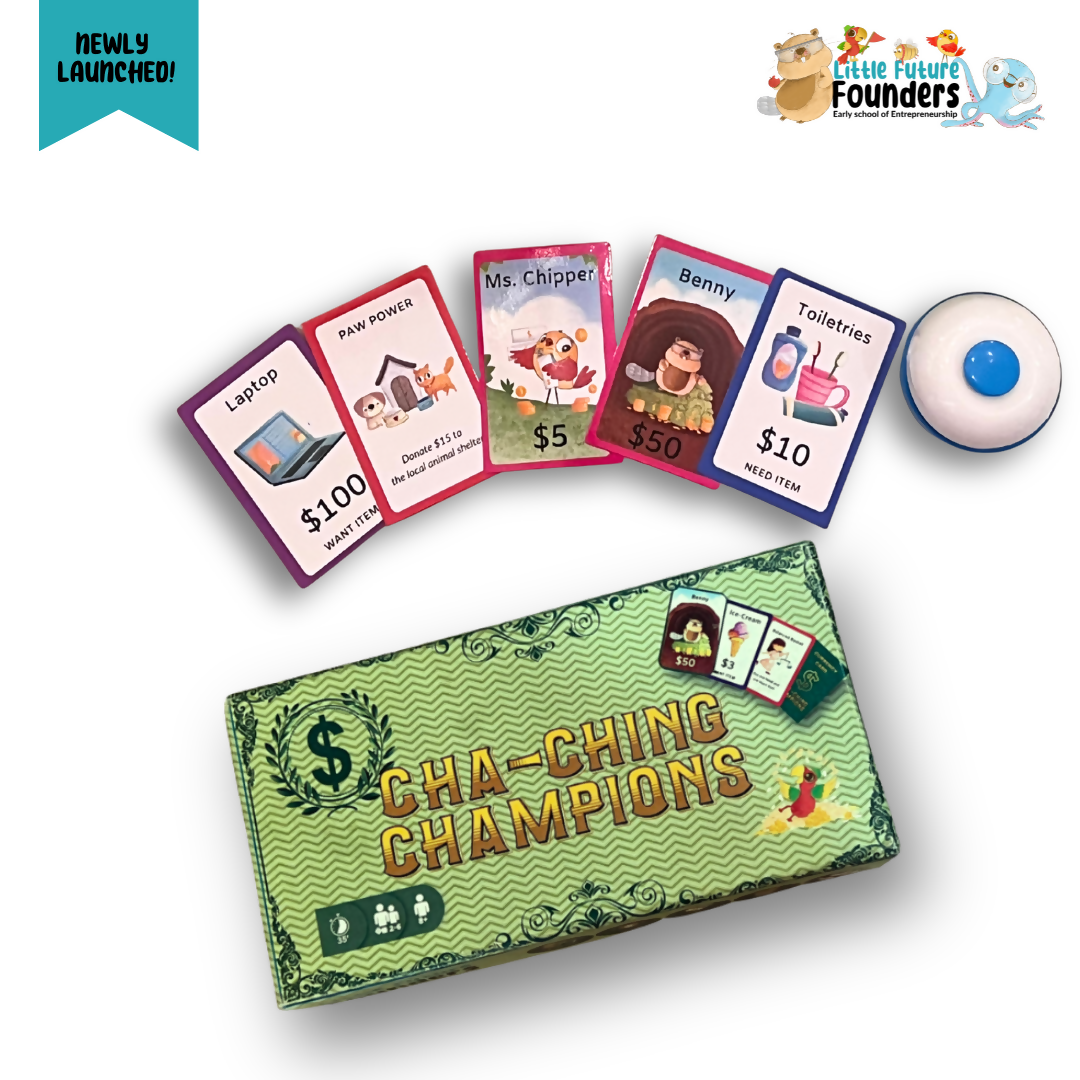 Cha-Ching Champions — the ultimate money-smart card game for curious little minds! This fun-filled game that helps children understand the difference between needs and wants, the importance of financial goals and the joy of achieving them!