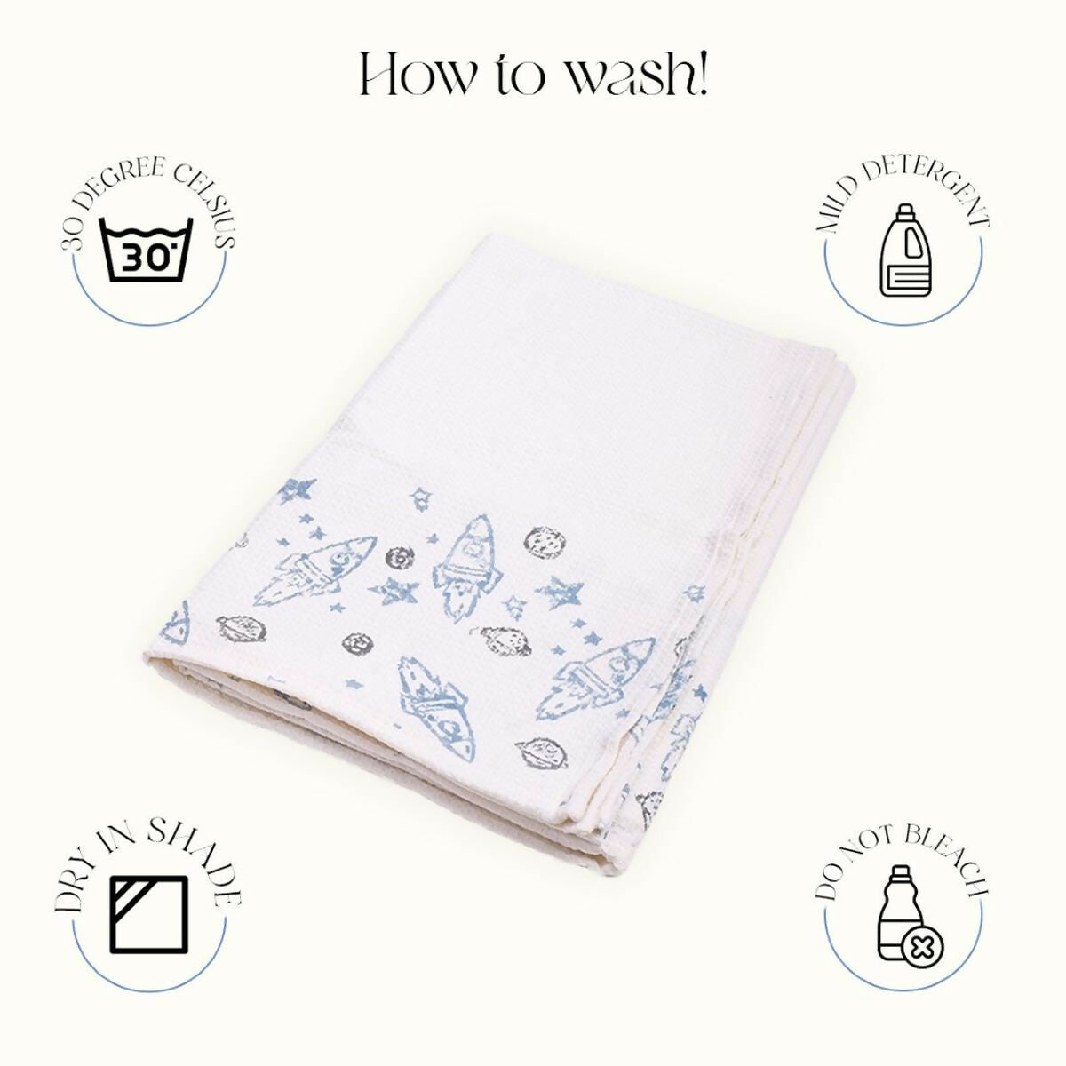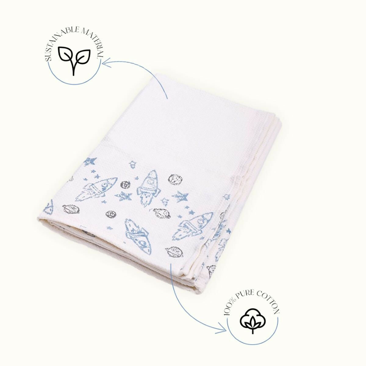 A classic must have. Our 100% Cotton Hand blocked towels are super absorbent and super quick drying! A perfect match with our Rocket Star Quilt and Dohar. 100% Cotton Hand Blocked waffle.