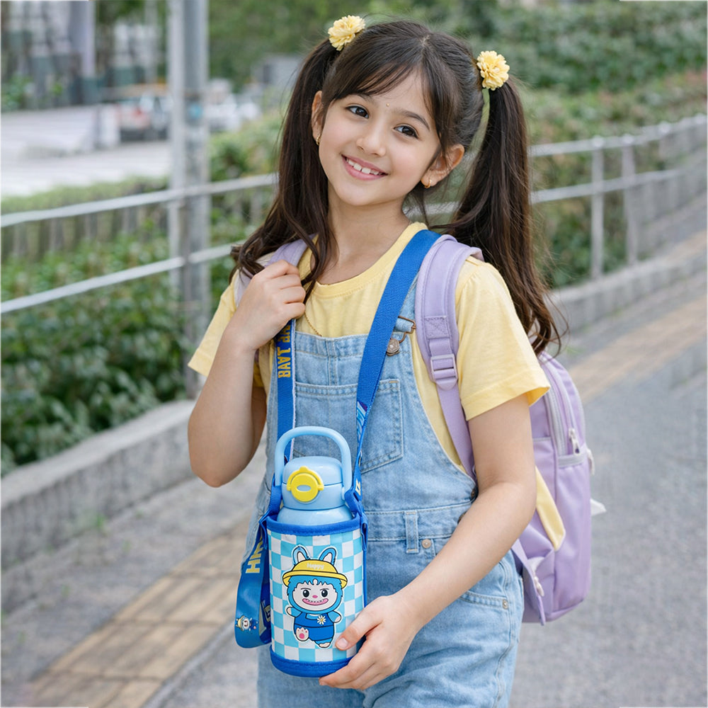 LSB, Blue Checks Labubu with Matching Cover Stainless Steel Water Bottle for Kids,500 ml