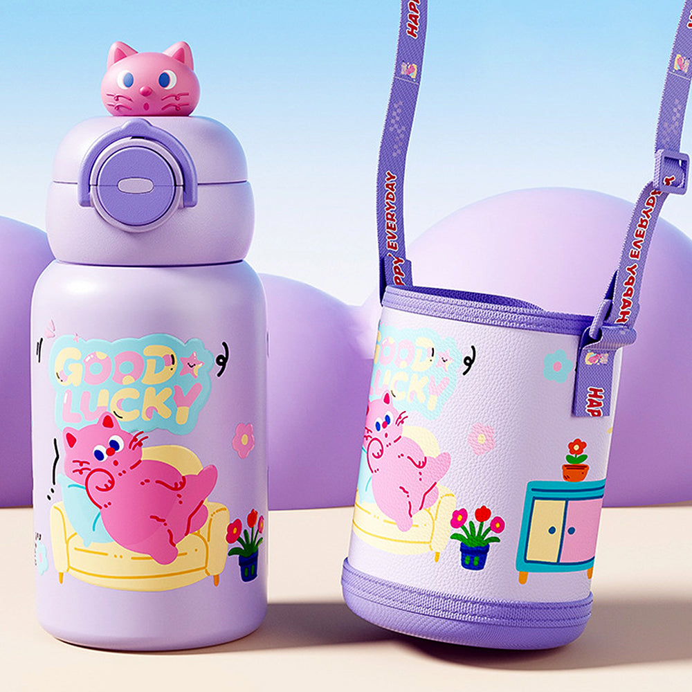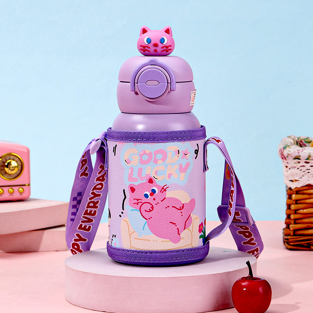 LSB, Purple Cat 3d Face Lid with Matching Cover Stainless Steel Water Bottle for Kids,550 ml