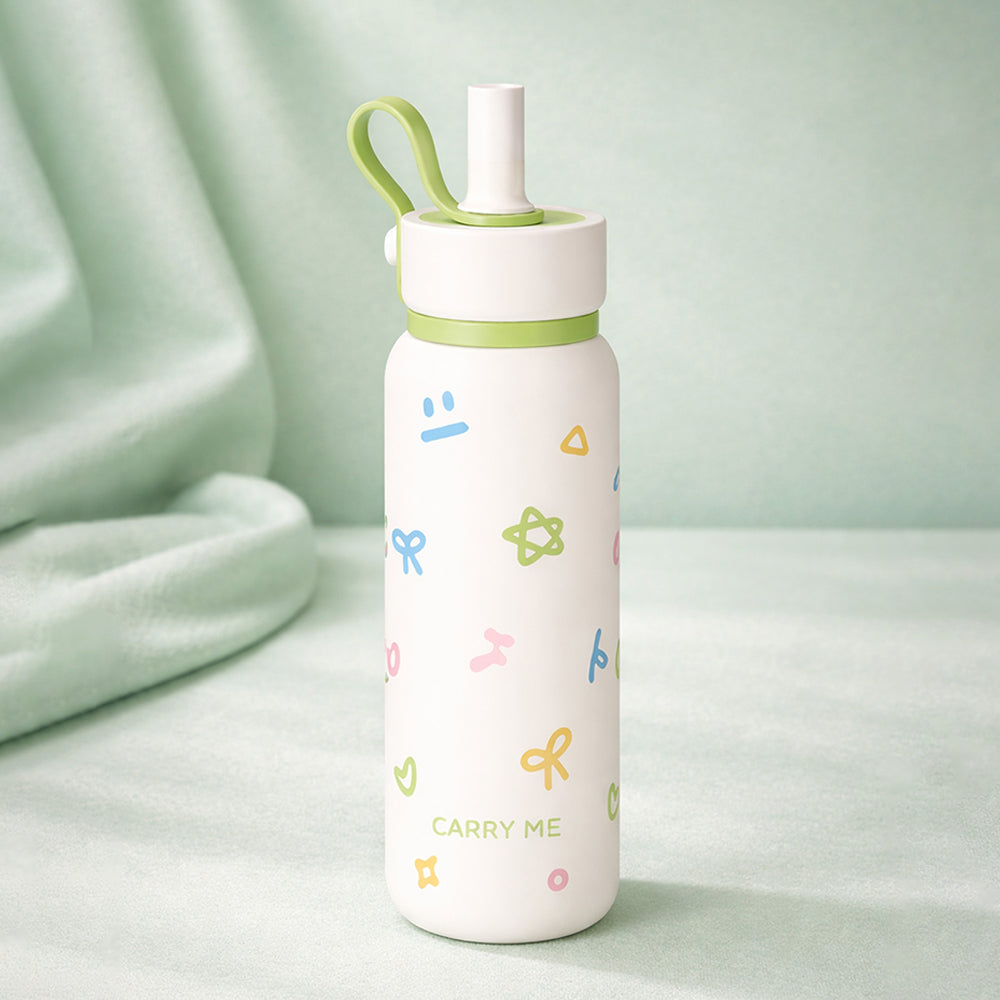 LSB, Cream Green Bow & Star Jumbo Straw Series Stainless Steel Water Bottle fot kids, Teens and Adults,700 ml