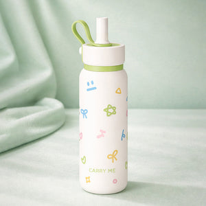 1. Design & Feature: This exclusive bottle is from the Jumbo Straw series collection. The thick silicone straw makes it really convenient to take in big sips of water with ease . The cream base paired with pastel bows, stars, fun doodles, and fresh green detailing gives this bottle a sweet, eye-catching appeal. A perfect piece for the ones who love all things truly functional and yet quirky.