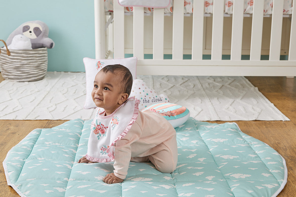 The Parachute Play Mat features dreamy cloud and balloon prints on a quilted, cushioned surface. Measuring 100 cm x 100 cm, it offers a safe, cozy space for tummy time or play. Lightweight and portable for effortless transport.