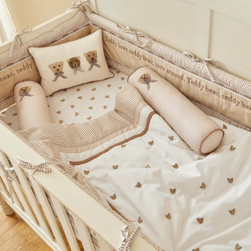 Create the Perfect Coordinated NurseryThe Teddy crib bedding set adds timeless charm to your baby s nursery with its soft brown and beige tones, adorable teddy bear embroidery, and classic gingham checks. Featuring the playful Teddy Bear, Teddy Bear rhyme on the bumper, this set is as delightful as it is cozy.What s Included:1 Fitted Cot Sheet with teddy bear prints1 Padded Cot Bumper with the Teddy Bear, Teddy Bear rhyme and ties for safety1 Soft Comforter2 Cot Pockets for easy storage2 Bolsters with teddy bear embroidery1 Rectangle CushionNursery Bedding Safety:Secure bumper ties tightly outside the crib.Remove bumpers once your baby can pull up.Avoid placing pillows, toys, or blankets in the crib during sleep.Customization AvailableCot sheets and bolster covers can be tailored to fit your crib perfectly.