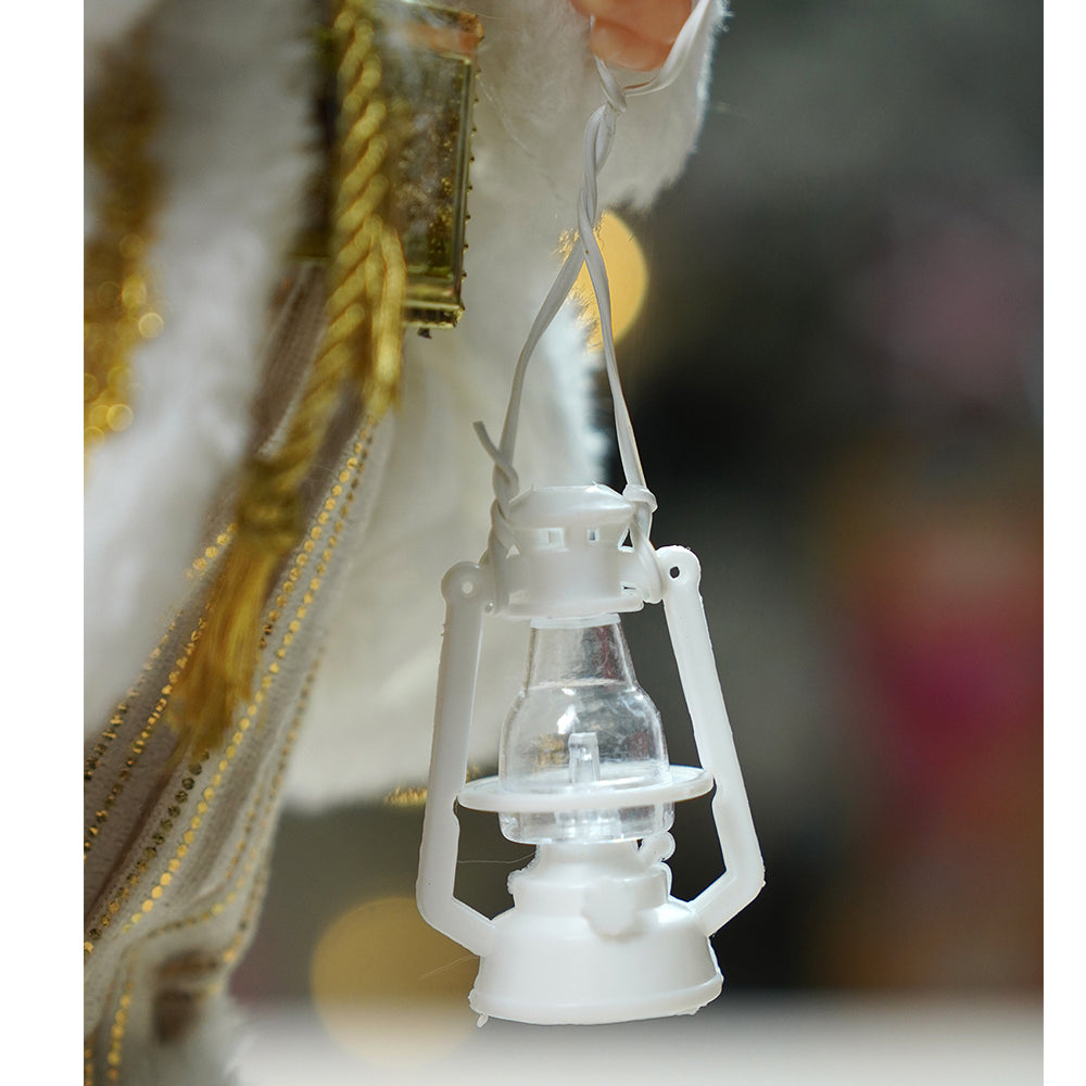 2. Detailing: Designed with luxurious fabric, golden embroidery, and fine detailing, this Santa holds a white lantern in one hand and a golden gift sack slung over his shoulder, symbolizing light, joy, and the spirit of giving. The shimmering gold tones and soft textures make it a refined statement piece that enhances both modern and traditional festive setups.