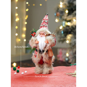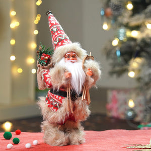 2. Detailing: Designed with soft fur fabric, snowflake-patterned knitwear, and wooden accessories, this Santa carries a pair of wooden skis in one hand and a burlap sack filled with pine branches and berries on his shoulder, symbolizing the spirit of winter adventures and the joy of Christmas giving.