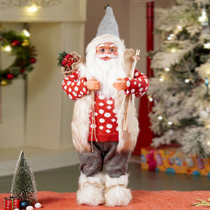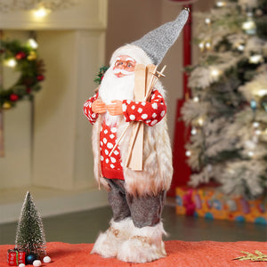2. Detailing: Designed with soft faux fur, knit textures, and rustic wooden elements, this Santa holds a pair of wooden skis, symbolizing winter fun, joy, and adventure. The contrast of bright red tones with natural beige and white fabrics gives it a warm, homely Christmas appeal that never goes out of style.