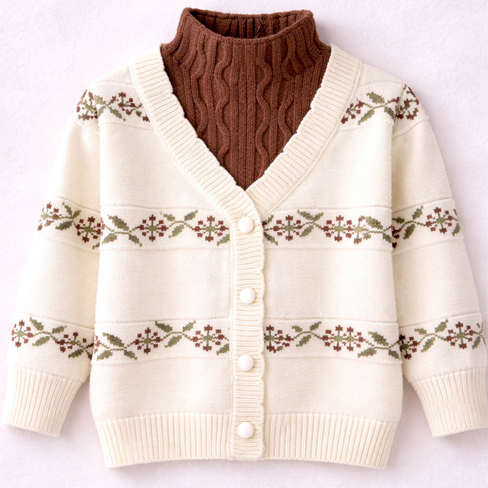 Cream & Brown Leaf Pattern High-Neck Cardigan, Winter Cardigan Sweater for Kids
