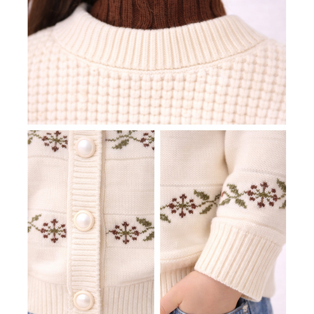 1. Design: This softly knitted winter cardigan is a beautiful choice for little ones who love a calm, elegant, and stylish look. The warm cream sweater features a lovely pattern of brown and green leaves across the front and sleeves, along with decorative buttons that add a charming touch. The scalloped design near the neckline gives it a soft and elegant finish.