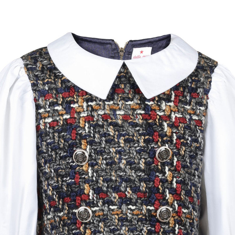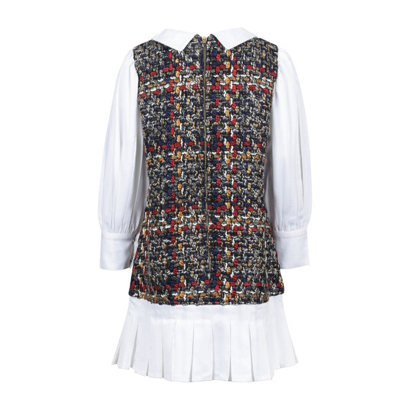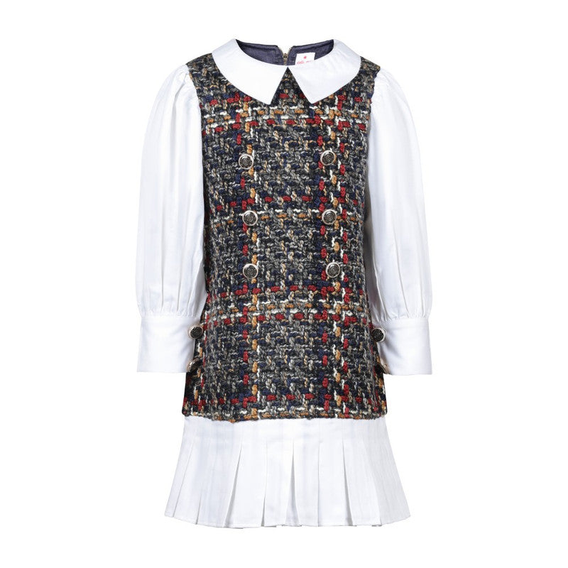 Stylish tweed dress in a vibrant multi-color palette with button details and a classic collar, blending sophistication with playful charm.