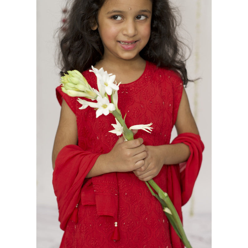 A beautiful chikankari kurta sharara set featuring all over front embroidery, matching embroidered dupatta and sharara. It is finished with sparkling red cut dana work. Designed in soft, breathable fabric - perfect for little girls who love to twirl.