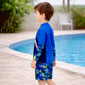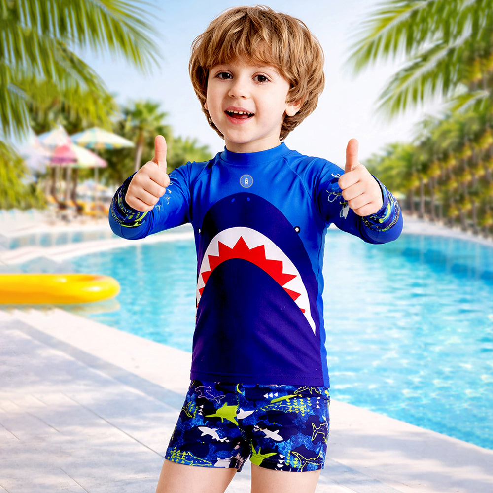 1. Design: Designed in a vibrant blue base with a bold shark graphic on the front, this swimwear creates a fun and ocean-inspired look for kids. The sleeves and shorts feature playful shark prints, adding a adventurous touch to the overall outfit.