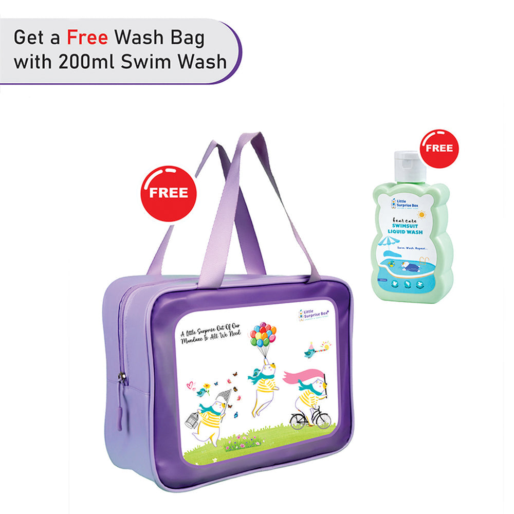 4. Fit Type: The full sleeve t-shirt is easy to wear and offers a comfortable fit, while the shorts feature an elastic waistband for a secure fit, allowing free movement and all-day comfort. 5.Free Wash Bag: This product comes with a free swim bag, making it easy for kids to carry their swimwear around, even when it is wet.