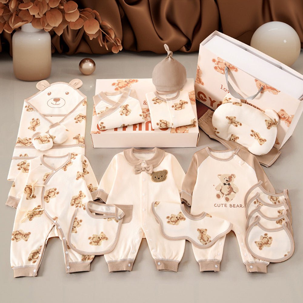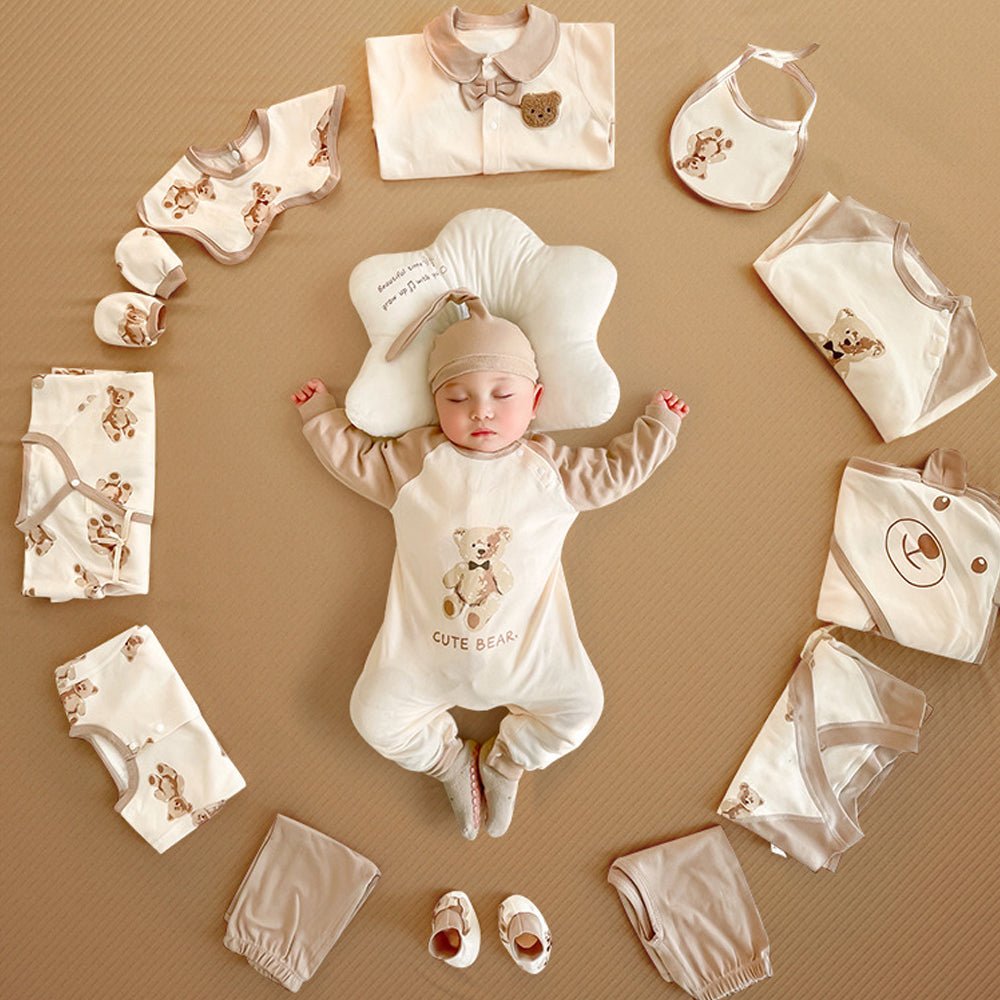 The hamper comprises of 26 pcs which includes 3 button Romper; 2 Lace Rompers; 1 Pillow; 4 Small Bibs; 1 Big Bib; 1 Diaper Pant; 2 Pants ; 1 Quilt; 1 Bellyband; 2 Gloves; 2 Foot cover; 1 Cap; 4 Napkins. Parents can be rest assured about the quality of our product as we use quality fabric which is easy to wash and breathable. We are sure that baby will smile & feel comfortable after wearing these clothes. Our Hampers are also such a fantastic gift to present your loved one. The Beautiful Packaging and the content ensure that it brings in a broad smile to any new set of parents who receive it.