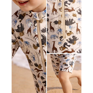 1. Design: Designed in a soft neutral base with all-over animal kingdom prints, this swimsuit brings a playful and adventurous vibe to your child’s swimwear.