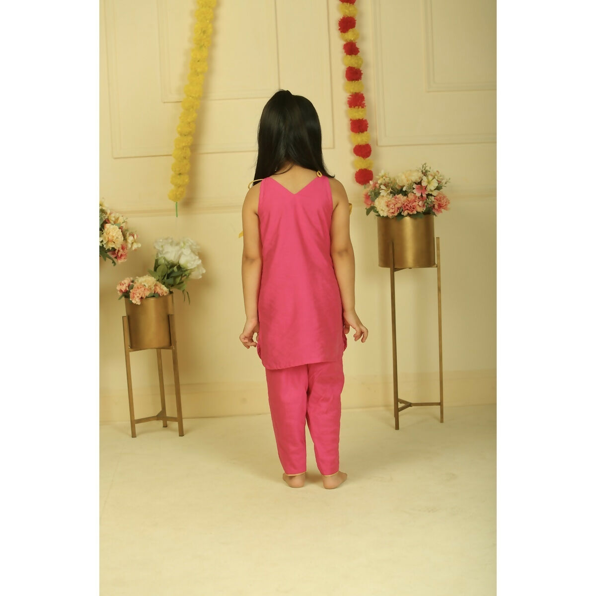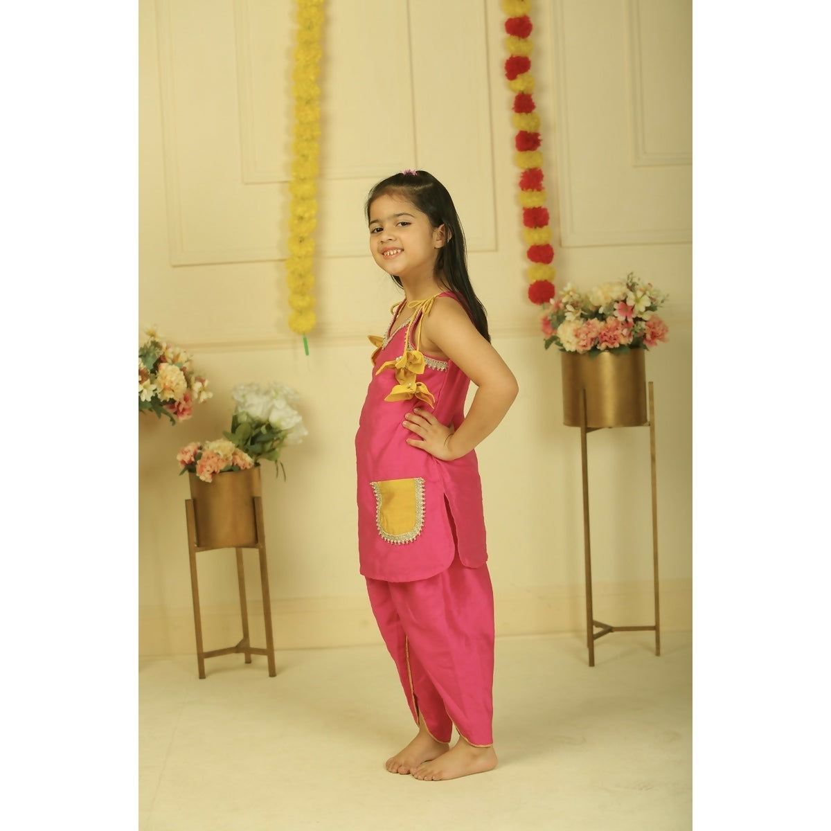 A striking pink halter-style straight top adorned with delicate golden lace detailing, paired with contrasting dhoti pants. This vibrant ensemble blends festive charm with modern elegance—perfect for little trendsetters.
