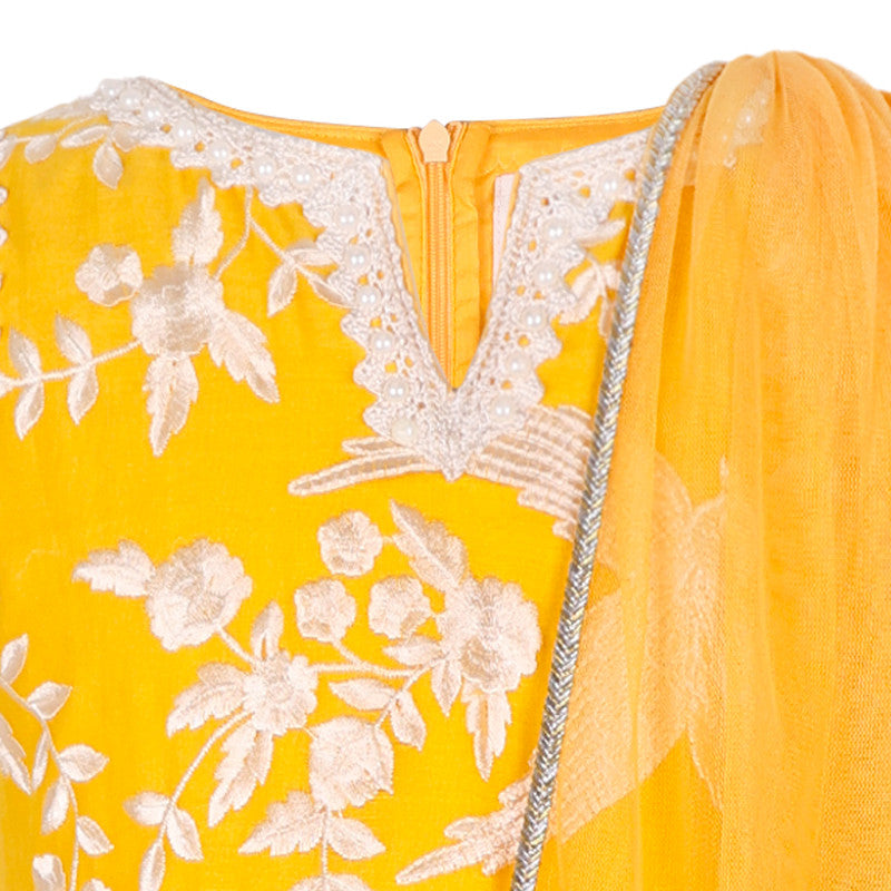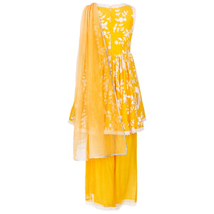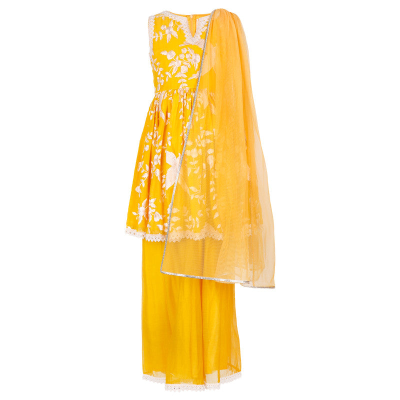 From Rang by Les Petits, this vibrant yellow sharara set features a beautifully printed kurta paired with flared bottoms and a matching dupatta. Crafted in lightweight, breathable fabric, it offers comfort with festive charm—perfect for celebrations, weddings, and special occasions.